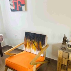 Add a modern Afro-artsy twist to your living space with this handcrafted accent chair from Woodsworthinterior. Featuring a vibrant orange seat cushion and an expressive backrest panel adorned with hand-painted abstract art in rich earthy tones, this chair fuses functionality with bold artistic flair.