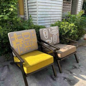 Infuse your space with bold heritage and sleek design using this Afro-minimalist lounge chair set from Woodsworthinterior. Each handcrafted chair features unique tribal-inspired motifs embroidered on a neutral-toned backrest, paired with contrasting seat cushions – one in vibrant mustard yellow and the other in warm earth brown.