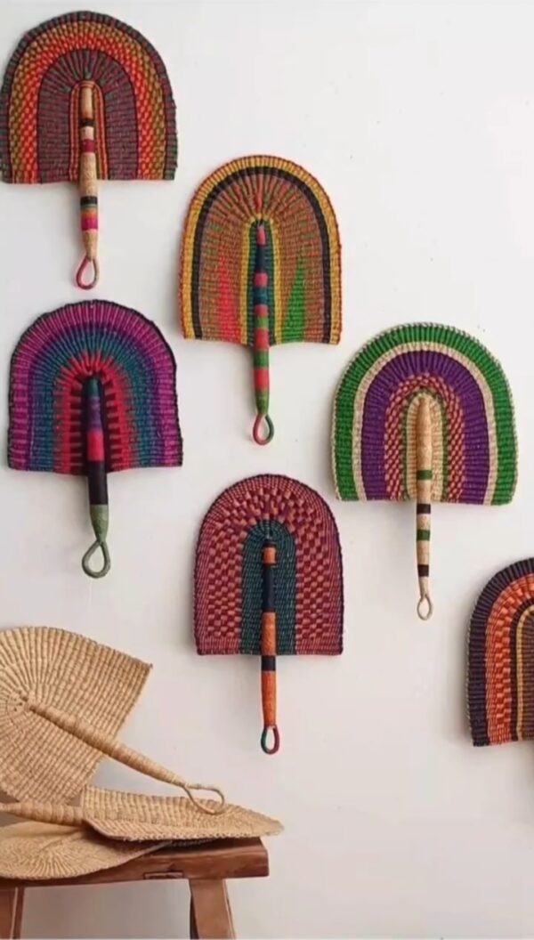 Each fan is uniquely handmade, showcasing a rich mix of colorful patterns and traditional African weaving techniques. No two fans are exactly the same, making every piece a truly special work of art.