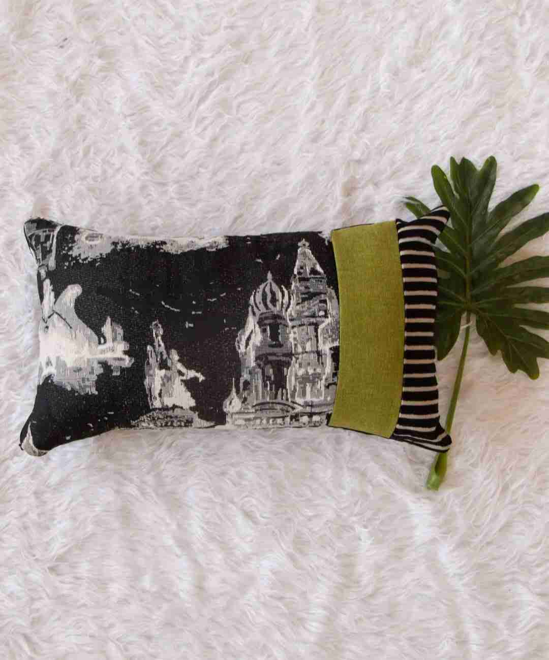 Elevate your home’s aesthetic with this striking lumbar pillow from Woodsworthinterior — a brand known for its refined blend of African inspiration and cosmopolitan elegance. This particular piece combines rich black-and-white imagery with an architectural print, accentuated by a bold olive green panel and striped edge for contrast.